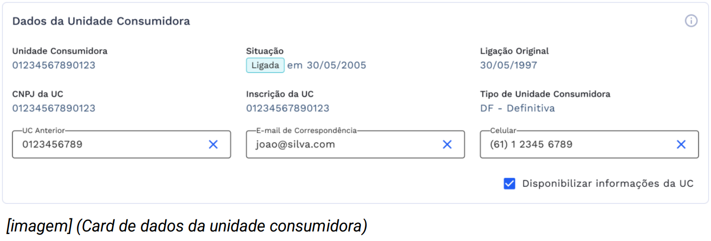 - No grupo de dados da unidade consumidora contamos com alguns dados em modo leitura, onde não podem ser alterados: número da unidade consumidora, situação da UC, ligação original, CNPJ da UC, inscrição da UC e tipo de unidade consumidora.