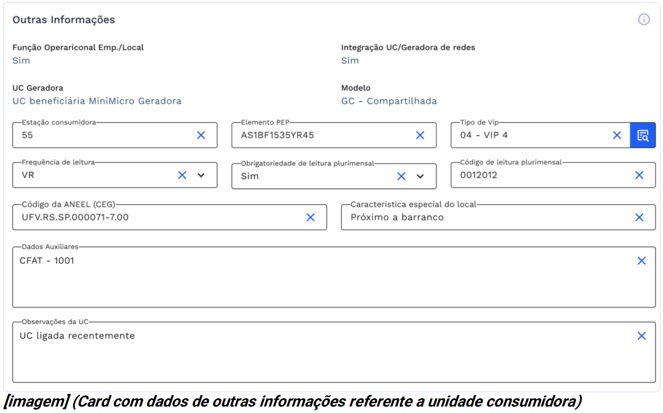 - Em outras informações os dados de função operacional, integração UC/geradora de redes, UC geradora e modelo vem preenchidos apenas para consultas e informação ao cliente.