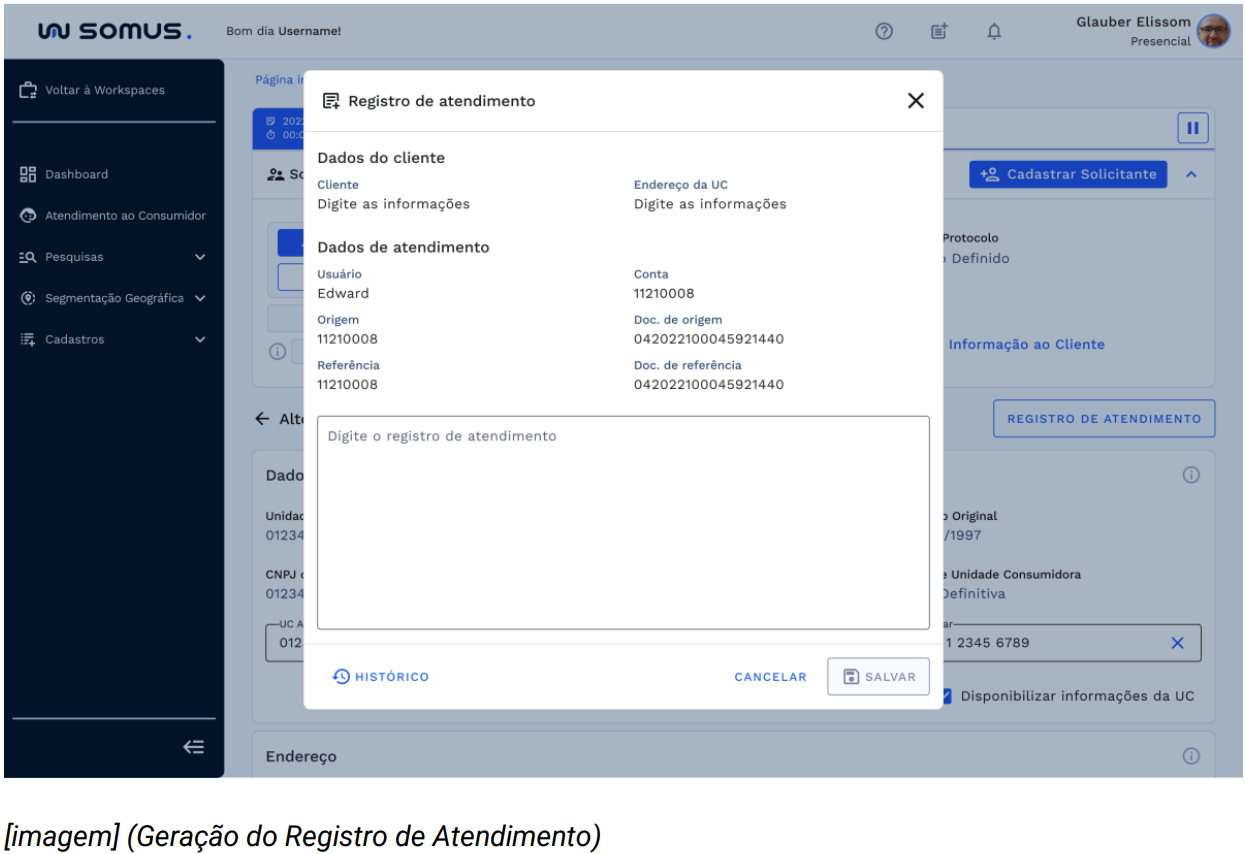 Ao selecionar o botão de registro de atendimento disponível ao lado do título da aplicação, será exibido uma janela com um breve resumo de dados, contendo: dados do cliente e dados do atendimento.