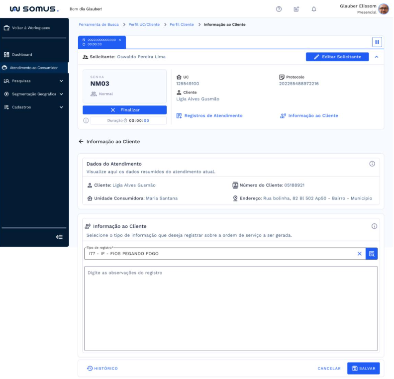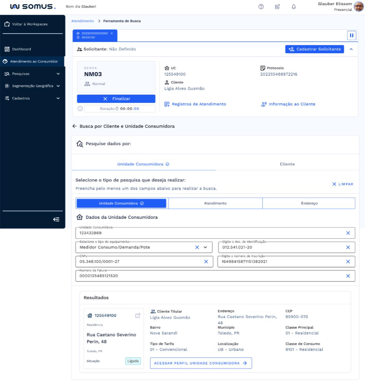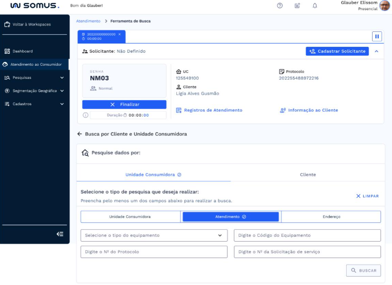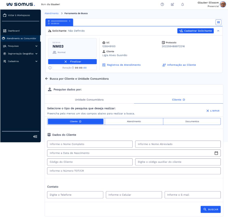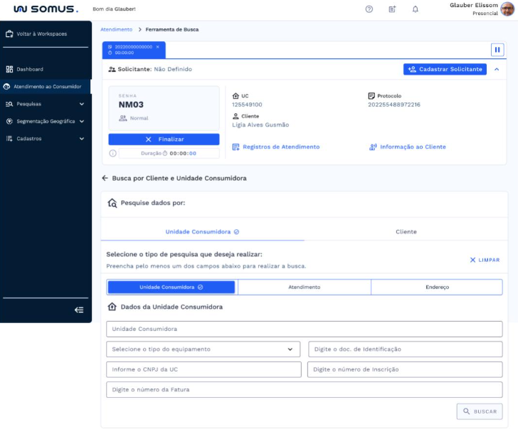 Após o atendimento ser iniciado, a ferramenta de busca por Cliente ou Unidade Consumidora será habilitada abaixo da barra de atendimento. Onde será possível realizar pesquisa por: