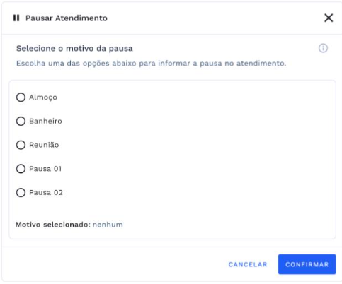 Ao clicar no botão de Pausar Fila, você não receberá novas senhas de atendimento, para essa pausa será aberto uma janela na qual será necessário selecionar o motivo da pausa.