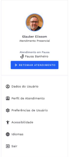 Para retomar a fila de atendimento e receber novas senhas, basta clicar no botão Retomar Fila de atendimento que fica na barra ou no menu de usuário clicando no seu avatar no canto superior direito da página, conforme imagem abaixo: