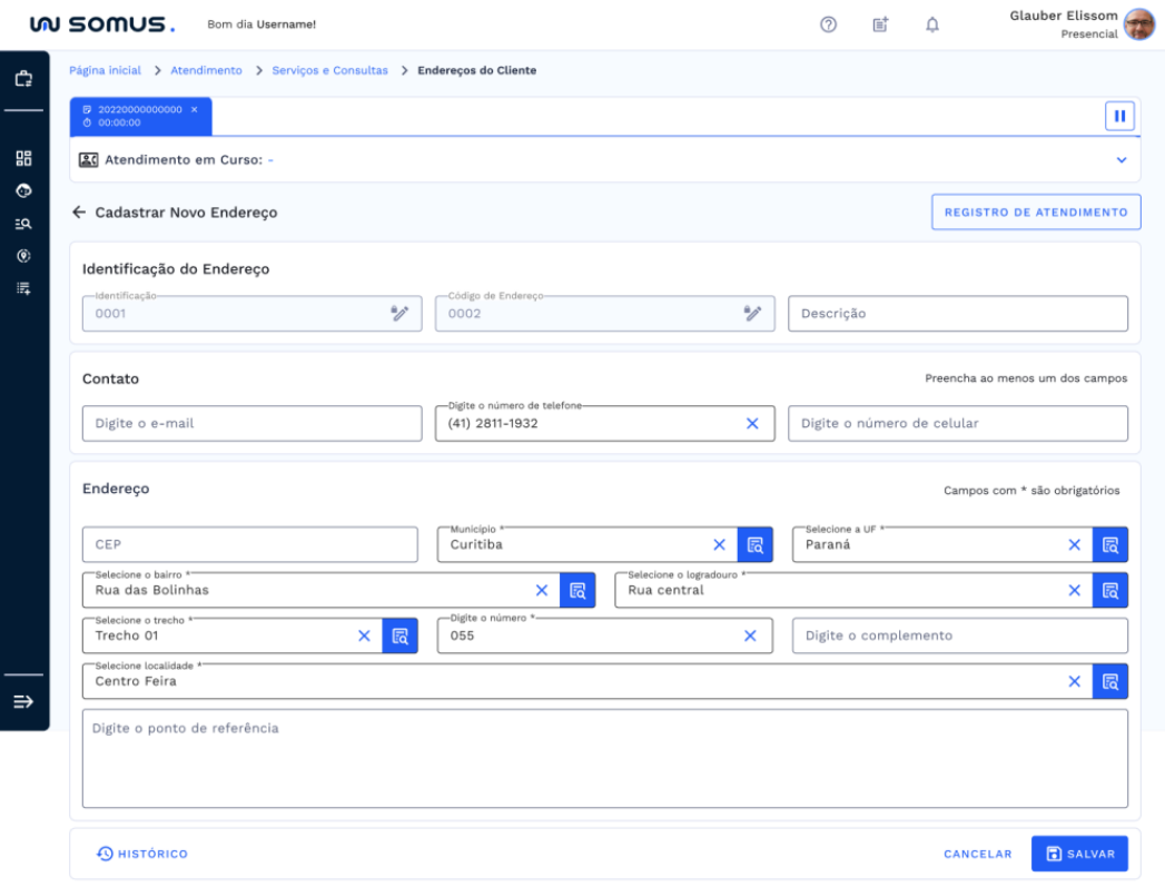 Endereço: No card de endereço apenas o CEP, complemento e ponto de referência são de preenchimento opcionais, os demais campos são obrigatório seu preenchimento, contamos com: município, uf, bairro, logradouro, trecho, número e localidade.